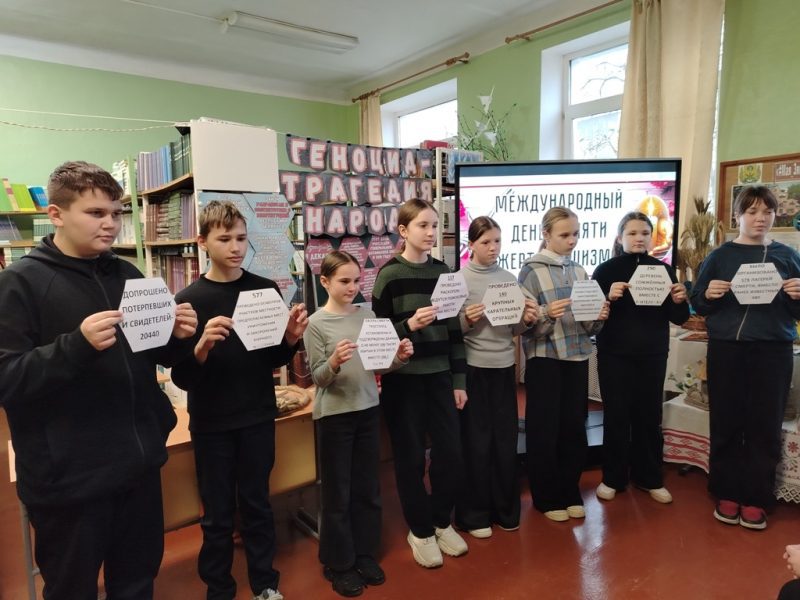 Под руководством библиотекаря В.В. Дроздовой учащиеся погрузились в реалии оккупационного режима 1941–1944 годов: узнали юридическое значение слова «геноцид» и убедились, что это не случайные жертвы войны, а целенаправленно и жестоко уничтоженное мирное население.