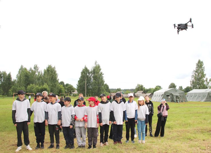 Главной фишкой мероприятия стал полет квадрокоптера. Погодные условия способствовали тому, что он был запущен в небо, зависал над школьным стадионом, где стоят палатки, где «зубры» участвуют в военно-патриотических мероприятиях.