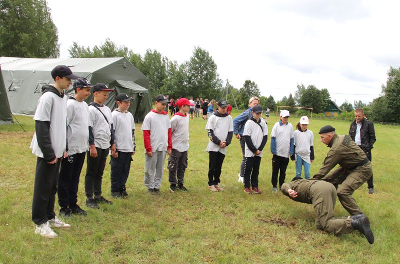 Пока одни ребята рассматривали образцы вооружения, другие участвовали в соревнованиях по мини-футболу, а третьи учились боевым приемам борьбы, самообороны и защиты у спецов из могилевского ОМОНа.
