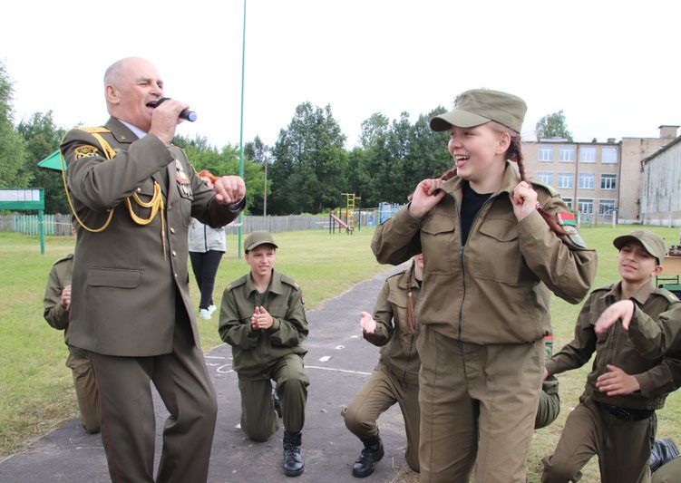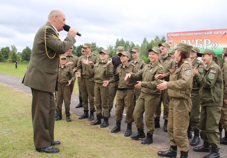 – Наша цель – воспеть подвиг народа-победителя, – говорит Григорий Жебит. – Вместе с ребятами будем петь «Катюшу». С военным оркестром я бывал в Хотимске, а вот в Костюковичах, в полевом лагере «Зубр», я впервые. Ребята здесь прекрасные, настоящие патриоты своей Родины. Они любят носить форму, многое знают о Великой Отечественной войне, изучают военную технику и оружие, усиленно совершенствуют свою физическую форму.