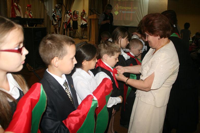 Какой же пионерский праздник без приема в пионеры! Ветераны пионерского движения: В.В. Смильская, Л.С. Исаева, В.С. Ковалева ( вместе с начальником отдела по делам молодежи райисполкомаН.В. Якушевой, дирктором ГУДО «Центр внешкольной работы» А.Н. Перепечиным, заместителем начальника отдела образования райисполкома С.В. Глушаковой) в торжественной обстановке повязали галстуки учащимся районной гимназии. Лучшим ветеранам и активистам пионерского движения были вручены дипломы и грамоты, сувениры.