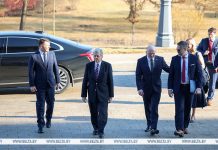 Церемония официальной встречи Президента Беларуси Александра Лукашенко Председателем Государственных дел Корейской Народно-Демократической Республики Ким Чен Ыном прошла в Пхеньяне, передает корреспондент БЕЛТА.