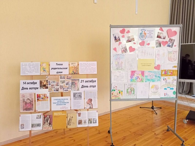 В актовом зале гимназии, где проходил единый урок, была оформлена выставка книг «Тепло родительской души», выставка рисунков и фотовыставка «Моя семья».