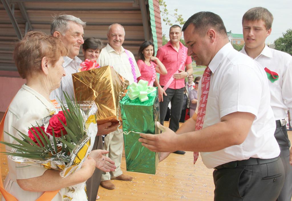 Приятным моментом в программе праздника стало торжественное чествование супружеских юбилеев. Существует мнение, что пожениться – проще всего. А вот сохранить семью, любовь и гармонию в ней на долгие годы – это самое ценное богатство. Поэтому люди, живущие вместе длительное время и при этом чувствующие себя по-прежнему счастливыми, заслуживают большого уважения. Семьи Агуреевых, Федосенко, Богачевых, Расторгуевых, Курочкиных, которые прожили вместе соответственно 10, 20, 30, 40 и 50 счастливых лет семейной жизни поделились своими секретами супружества. Председатель райисполкома Д. В. Малашенко вручил подарки и цветы семейным парам. В этой торжественной обстановке в вальсе закружились эти счастливые люди.