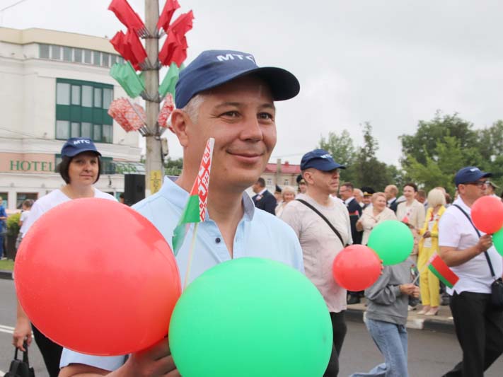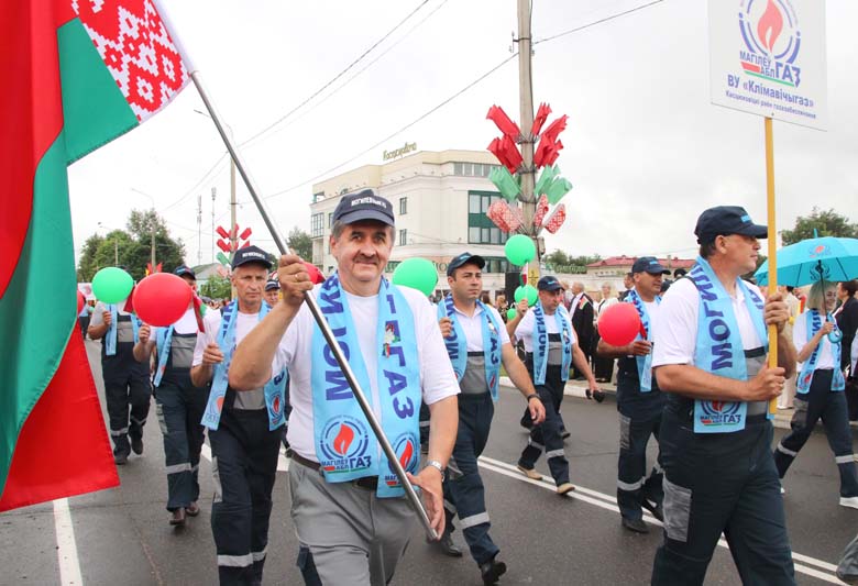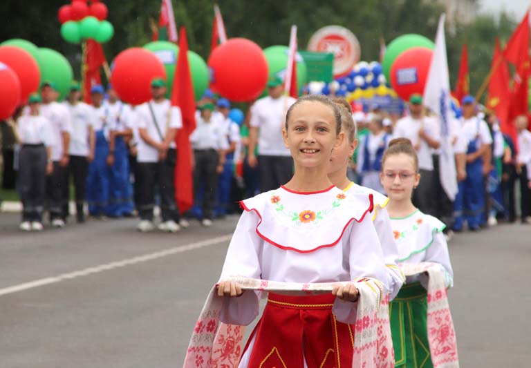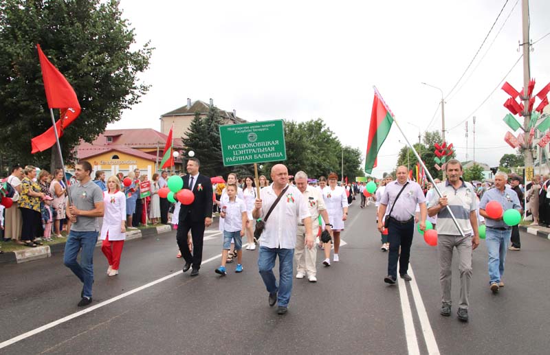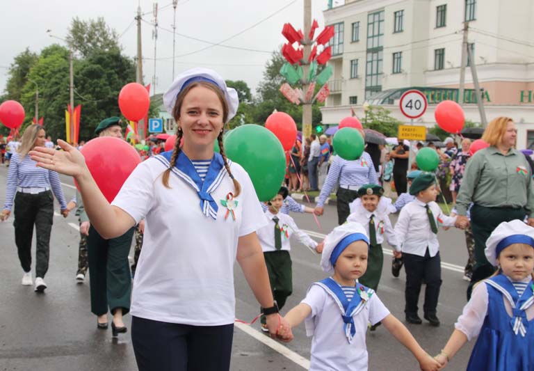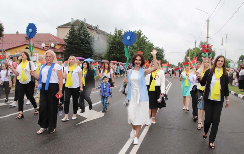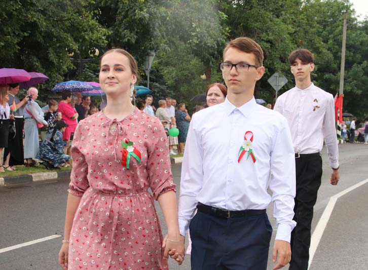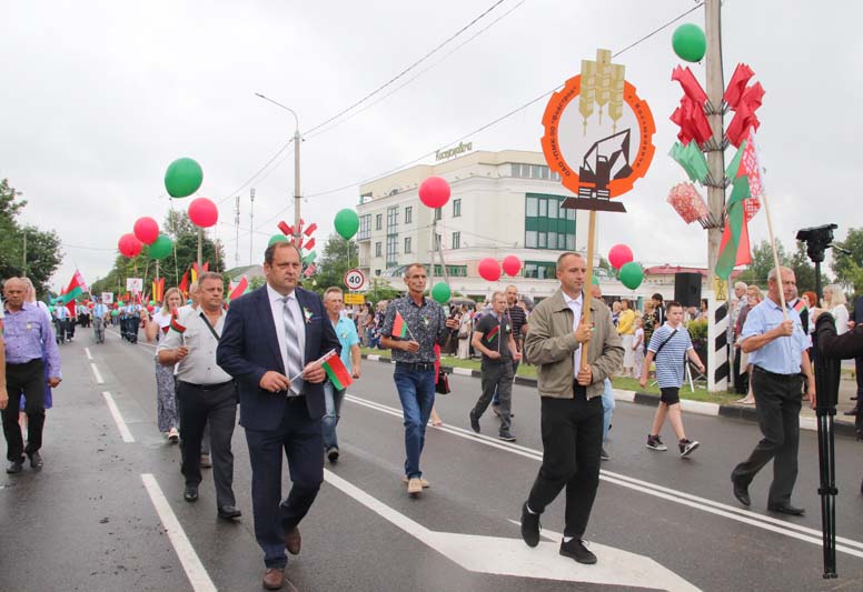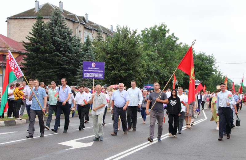 Праздничное тематическое шествие трудовых коллективов Костюковщины от Мемориала до площади амфитеатра состоялось в рамках празднования Дня Независимости Республики Беларусь и 80-летия со дня освобождения Беларуси от немецко-фашистских захватчиков.