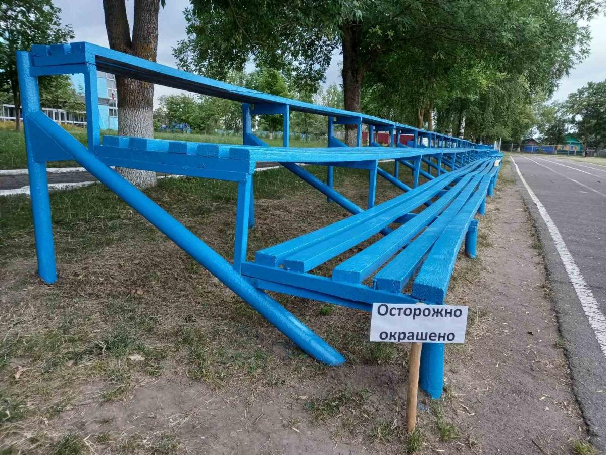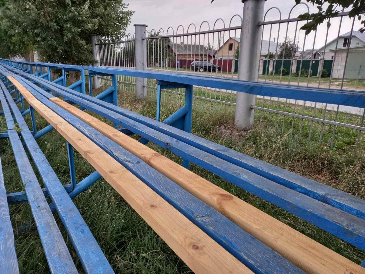 В настоящее время производится комплекс работ по уходу за футбольным полем, а также ремонтные работы трибун городского стадиона.