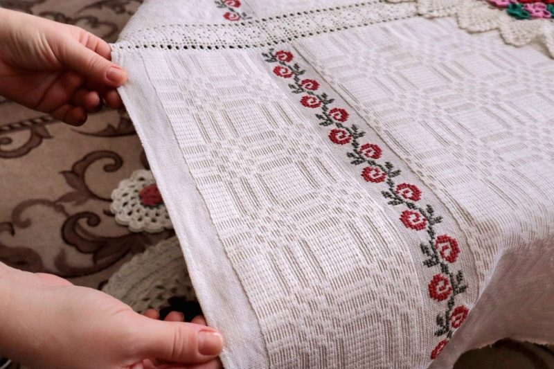 Вось Алеся беражліва бярэ ў рукі рушнік, якому больш за 70 гадоў і, разглядаючы яго, распавядае: