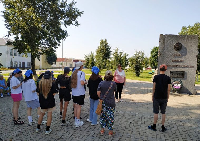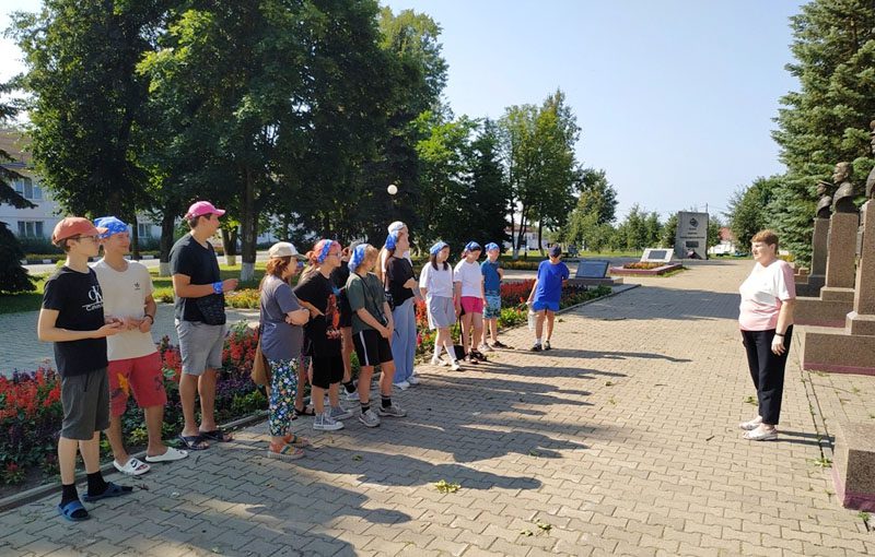 Библиотекарь Валентина Дроздова провела для воспитанников лагеря пешеходную экскурсию к Мемориалу, Аллее героев и памятнику воинам-интернационалистам. Валентина Васильевна рассказала о подвигах героев Советского Союза — уроженцев районного центра и Костюковичского района: Ф.М. Авхачёва, А.Н. Воронцова, М.И. Зиньковича, В.Ф. Маргелова, В.А. Скугаря, Н.П. Судиловского, которые героически сражались в годы Великой Отечественной войны, и отдали свою жизнь за освобождение нашего района от немецко-фашистских захватчиков. У подножия Мемориала ребята почтили память тех, кто защищал наш край.