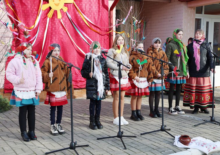 Культработнікі мясцовага ДК і раённага Цэнтра культуры цалкам рэканструявалі абрад. Жанчыны, пераапрануўшыся ў яркія народныя касцюмы і каляровыя хусткі, звонкімі галасамі спявалі песні. Па народных прыкметах лічылася: каб прыйшла вясна, усталявалася добрае надвор’е, а летам быў выдатны ўраджай, неабходна выканаць шэраг дзеянняў. Напрыклад, згуляць у гульню «Вясновыя вароты», калі жанчыны рабілі з хустак імправізаваныя вароты, а дзеці праз іх праходзілі з песнямі і карагодамі. «Вясна-красна, хадзі сюда! А ты, зіма, уцякай за ляса!» – спявалі вяскоўцы. Ці абавязкова моладзі трэба пакатацца на арэлях і паклікаць вясну. А яшчэ сур’ёзная ўвага надавалася птушкам. Лічылася, што ў дзень вясновага раўнадзенства прылятае сорак птушак, прыносячы з сабой цяпло. З кужэльнымі птушачкамі, якіх мацавалі да палачак, упрыгожваючы стужачкамі, гулялі дзеці, імітуючы палёт, а папяровых птушачак кідалі на ручніках.