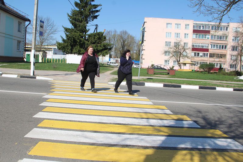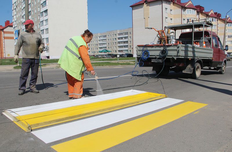 На помощь нашим дорожникам пришла могилевская организация СМЭП: рабочие нанесли ярко-желтую разметку пешеходных переходов.