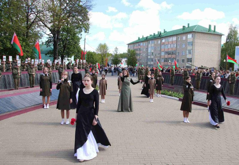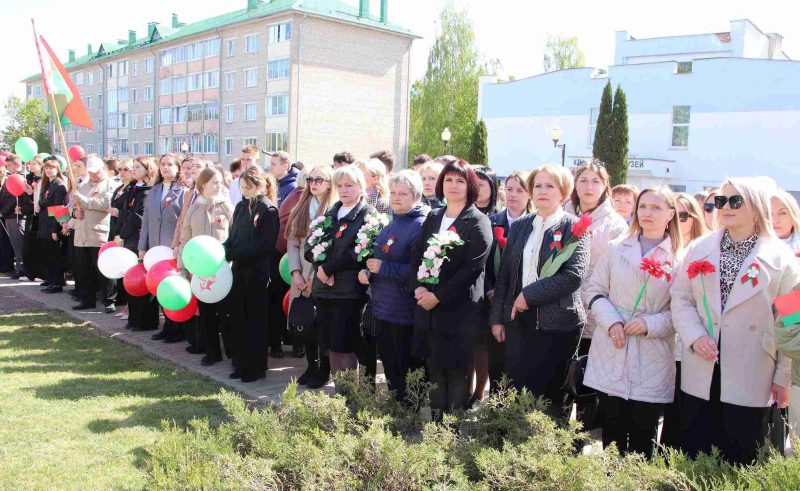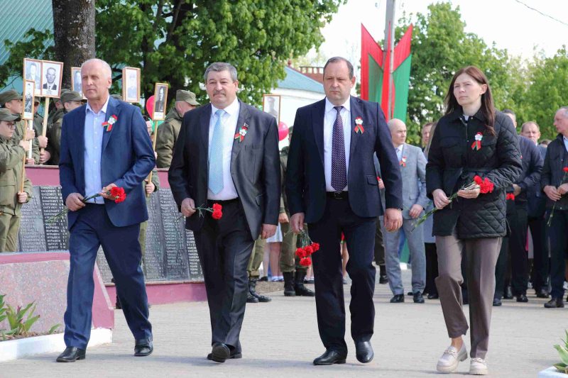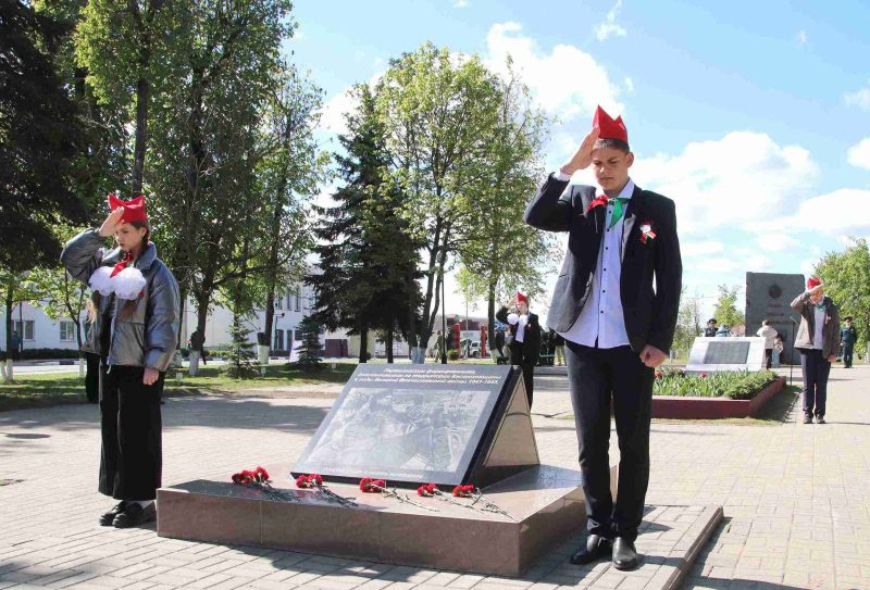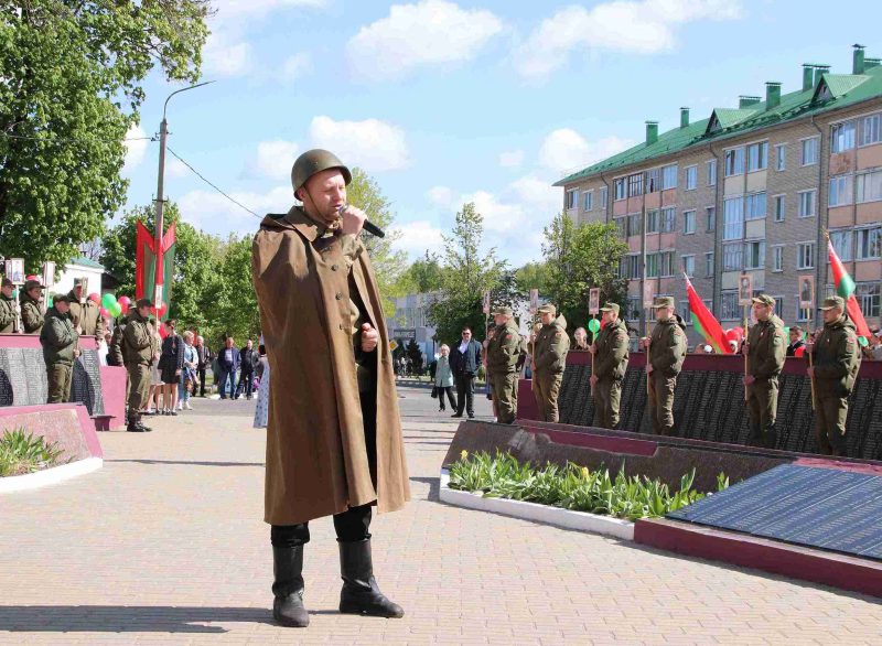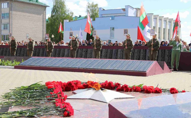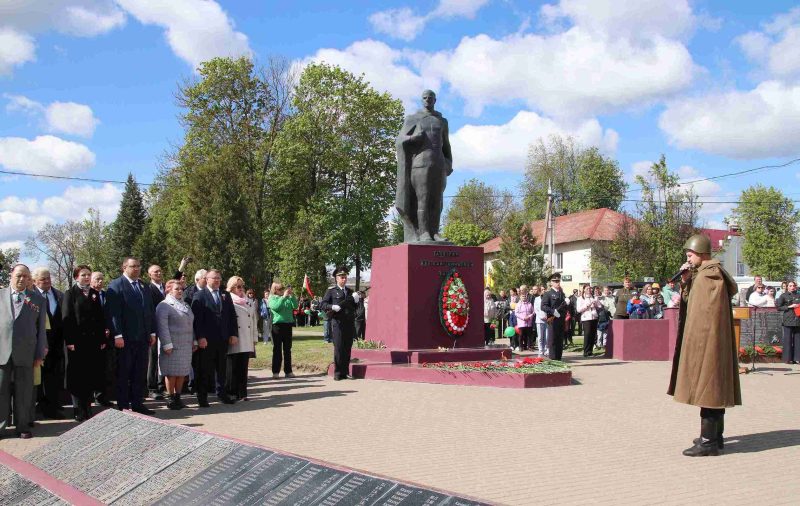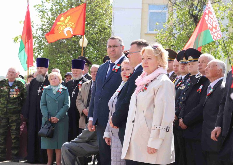Праздничный день начался на мемориале «Ахвярам Вялікай Айчыннай вайны», где собрались руководство района, представители силовых структур, трудовых коллективов и общественных организаций, духовенство, молодежь, школьники и воспитанники военно-патриотического клуба «Зубр». В торжественном мероприятии также приняли участие член Совета Республики, генеральный директор Белорусского цементного завода Игорь Сергеев, депутат Палаты представителей Национального собрания Республики Беларусь Александра Михеенко и сын командира партизанского отряда 5-й Клетнянской партизанской бригады Александра Михайловича Еремина Александр Александрович Еремин, а также многочисленные гости нашего города.