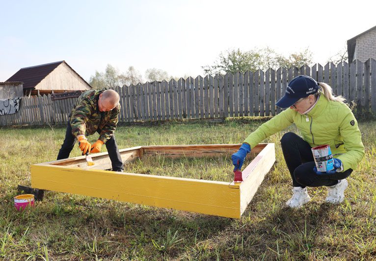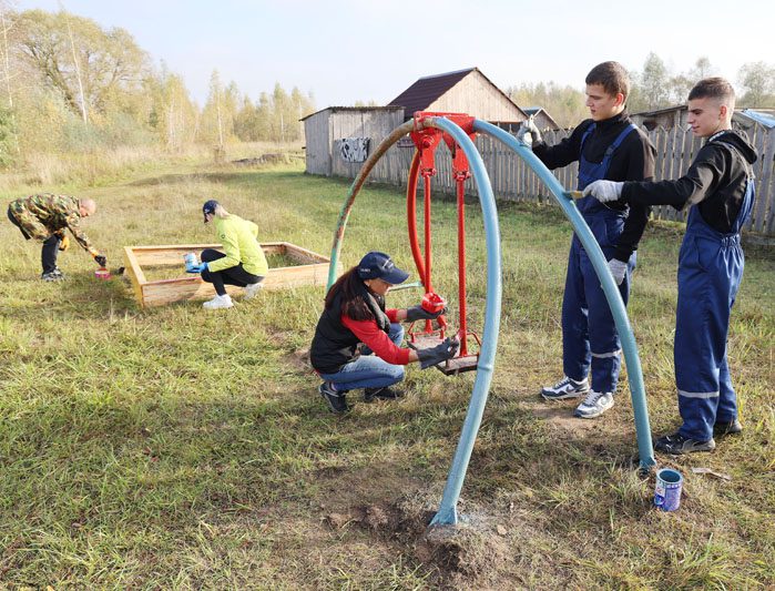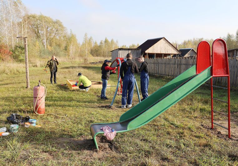 Не так давно на территории «леспромхоза» по просьбе местных жителей была установлена детская площадка – качели, горка, песочница и баскетбольное кольцо. Оборудование не совсем новое, но прочное. И чтобы площадка заиграла новыми красками, члены молодежного парламента при районном Совете депутатов и учащиеся колледжа взяли в руки кисточки.