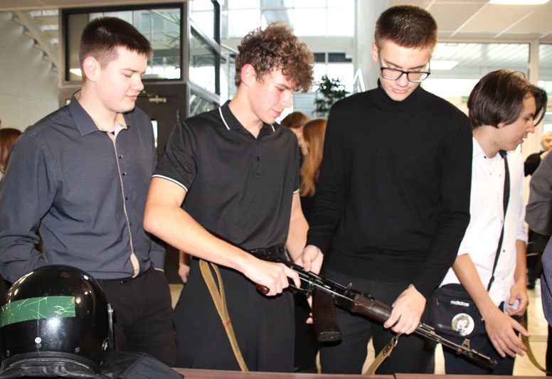 В фойе районного Центра культуры школьники могли примерить вооружение и снаряжение сотрудников МВД, необходимое для предупреждения и пресечения противоправных действий. О назначении каждого предмета рассказал командир отделения по охране территорий радиоактивного-загрязнения прапорщик милиции Александр Веденин.