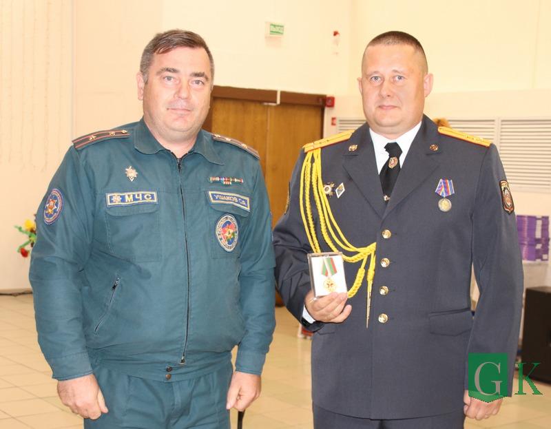 Заместитель начальника районного отдела по чрезвычайным ситуациям Сергей Ушаков вручил Памятную медаль «100 лет советской пожарной охране» начальнику Костюковичского отделения охраны Александру Белому.