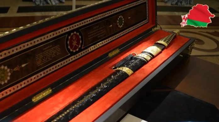 Султан Омана Хайсам бен Тарек Аль Саид после официальных переговоров с Президентом Беларуси Александром Лукашенко в Минске вручил ему оманский меч. Кадры с церемонии обмена подарками показали в эфире телеканала «Беларусь 1», сообщает БЕЛТА.