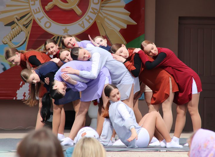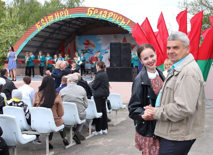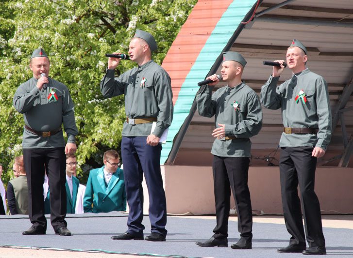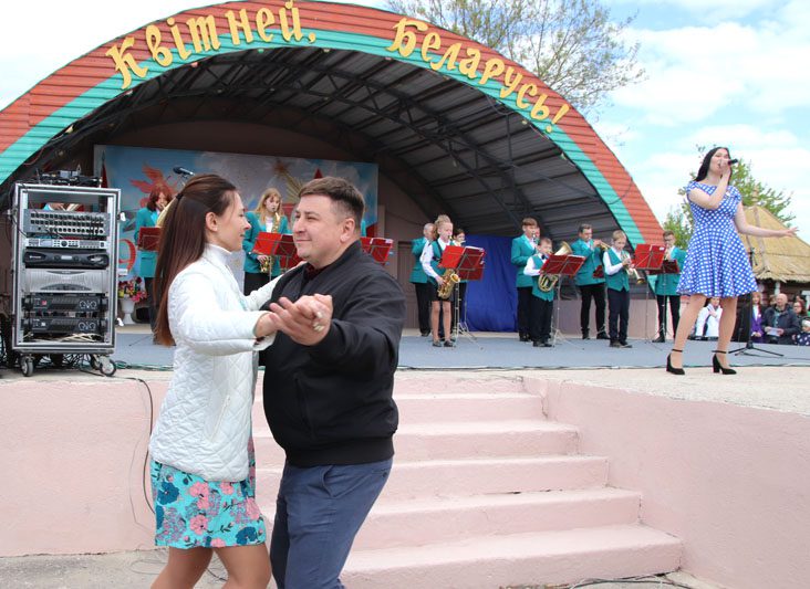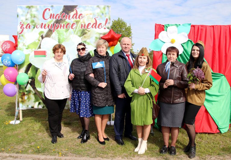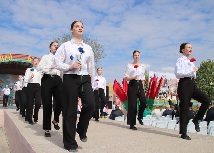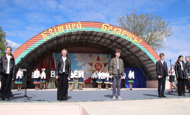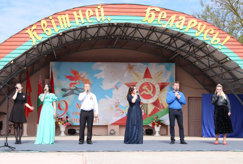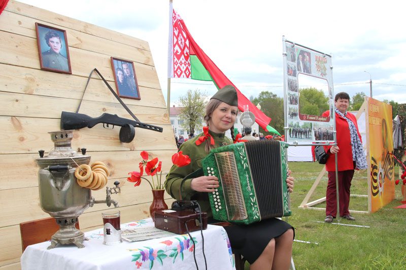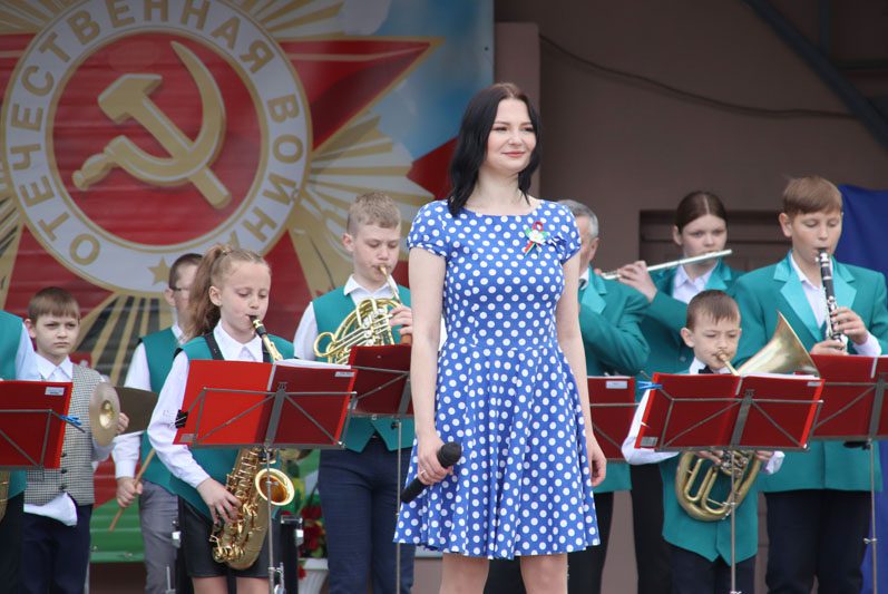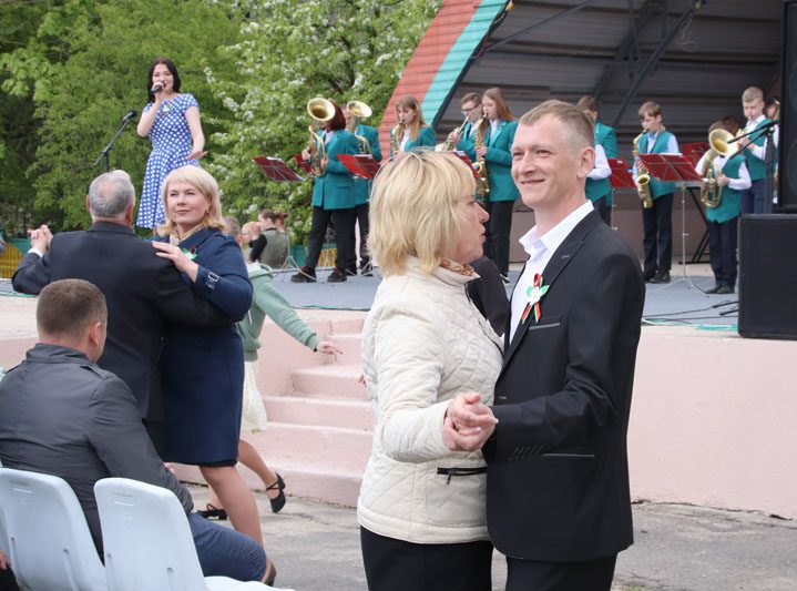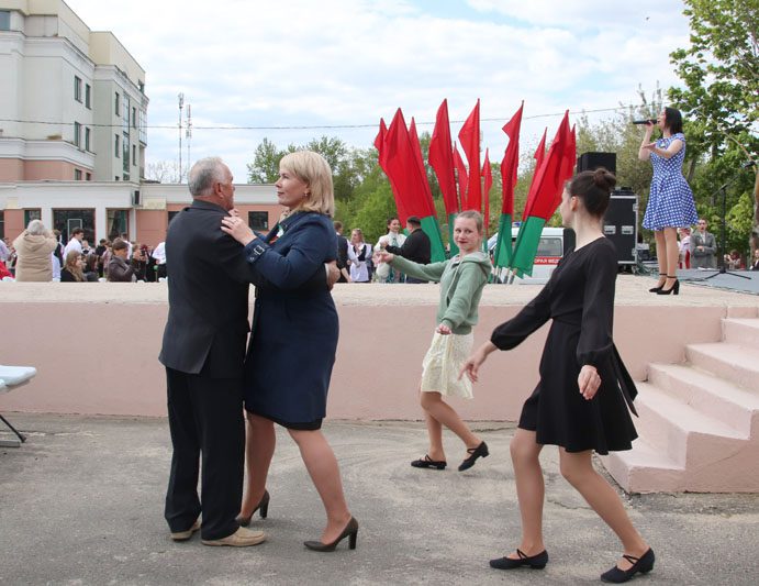 На сцене звучат песни военных лет, организованы различные тематические выставки, торговые ряды предлагают шашлык с пылу с жару и много вкусной продукции. Изюминкой праздника стал вальс учащихся школ города.