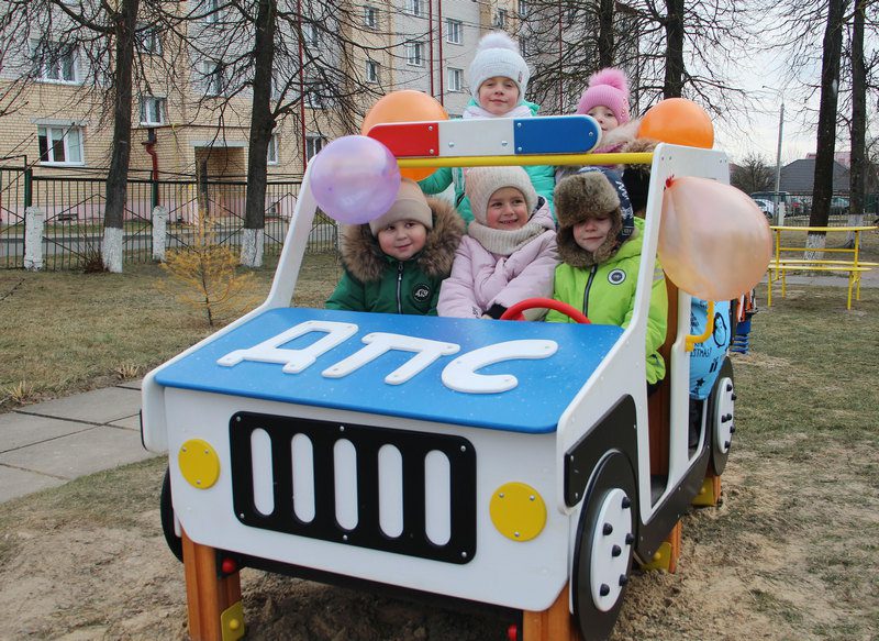 Паровозик с вагончиками, качалки на пружинках, машины ДПС и скорой помощи, песочница и другие игровые элементы – яркая тематическая площадка заметно преобразила просторный двор детского сада № 3.