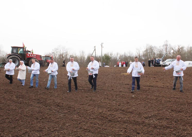 По старинному обычаю, прежде чем первое зерно упадет в землю, нужно поклониться земле и первой борозде, чтобы урожай был богатым. А еще – закопать горшочек с кашей и монетами в землю, чтобы всходы были ровными и сильными. Право совершить обряд предоставили Александре Михеенко и Александру Омельченко.