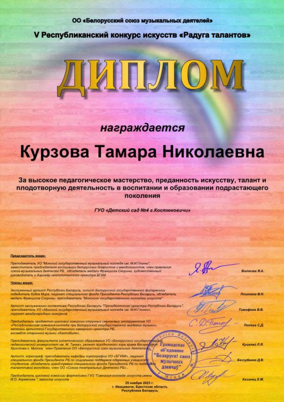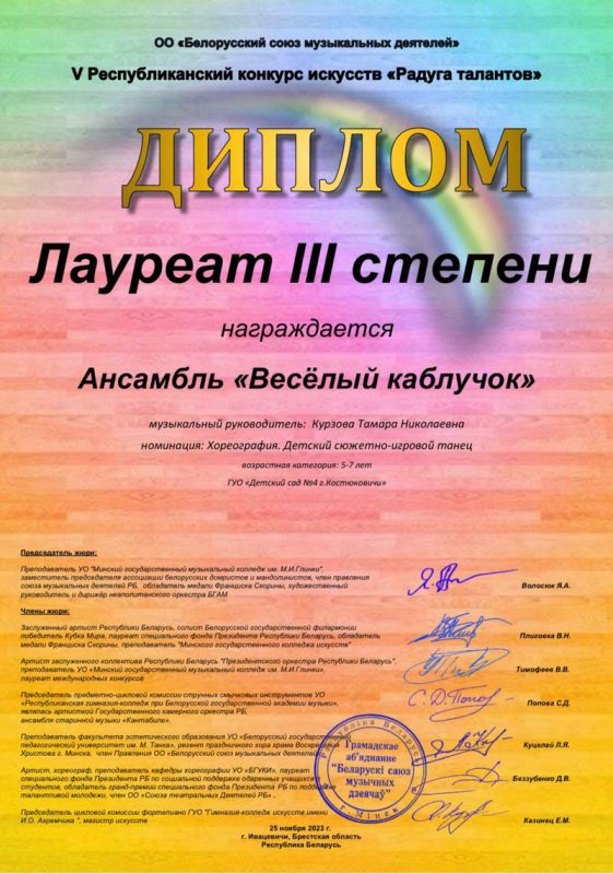 Воспитанники ГУО «Детский сад №4 г.Костюковичи» стали Лауреатами III степени Республиканского конкурса искусств «Радуга талантов», организованном ОО «Белорусский Союз Музыкальных Деятелей».