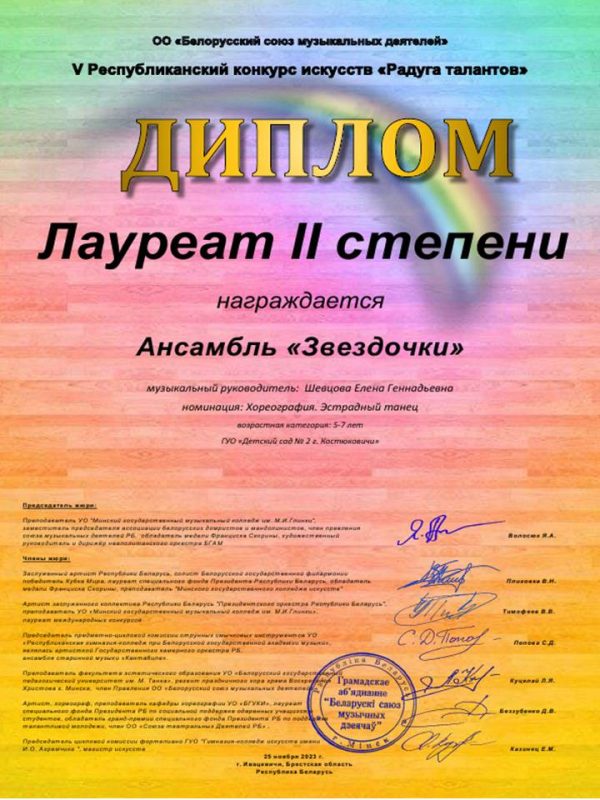Воспитанники ГУО «Детский сад №2 г. Костюковичи». под руководством Шевцовой Е.Г., музыкального руководителя высшей квалификационной категории, приняли участие в V Республиканском конкурсе искусств «Радуга талантов». Детский ансамбль «Звёздочки» представил на конкурс танцевальную композицию «Матуля Беларусь» и, в очередной раз, подтвердили свое мастерство. По итогам конкурса воспитанники награждены Дипломом Лауреата II степени, а музыкальный руководитель Шевцова Е.Г. награждена Дипломом за высокое педагогическое мастерство, преданность искусству, талант и плодотворную деятельность в воспитании и образовании подрастающего поколения.