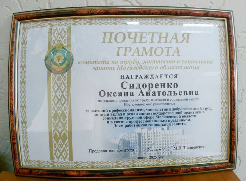 Среди награжденных — начальник управления по труду, занятости и социальной защите населения Костюковичского райисполкома Оксана Сидоренко. За высокий профессионализм, многолетний добросовестный труд, личный вклад в реализацию государственной политики в социально-трудовой сфере Могилевской области и в связи с профессиональным праздником — Днем работников социальной защиты Оксана Анатольевна награждена Почетной грамотой комитета по труду, занятости и социальной защите Могилевского облисполкома.