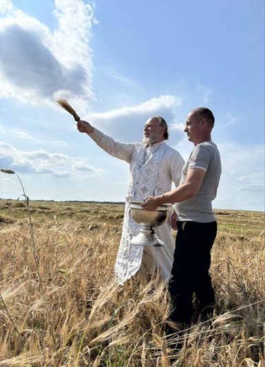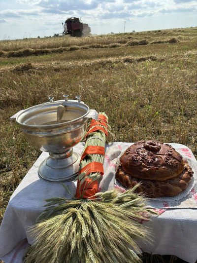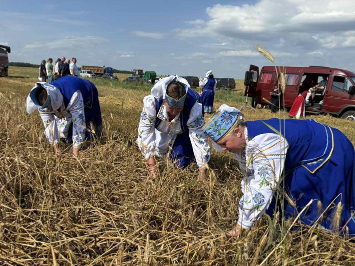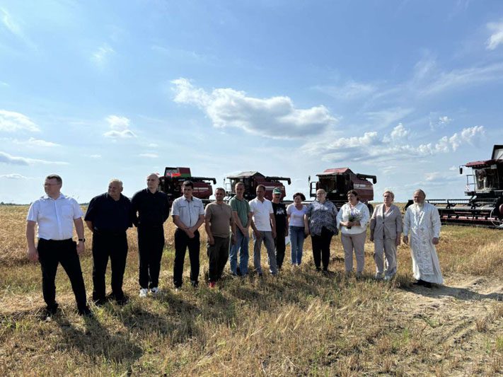 По традиции женщины с серпами сжали первые снопы. «Зажинки» сопровождались народными песнями. Это олицетворяет связь между прошлым и будущим, напоминая о ценности крестьянского труда и бережном отношении к земле. Такое благое дело было освящено настоятелем Свято-Крестовоздвиженского храма протоиереем Сергием, который прочитал молитву и окропил святой водой поле, технику и участников жатвы.