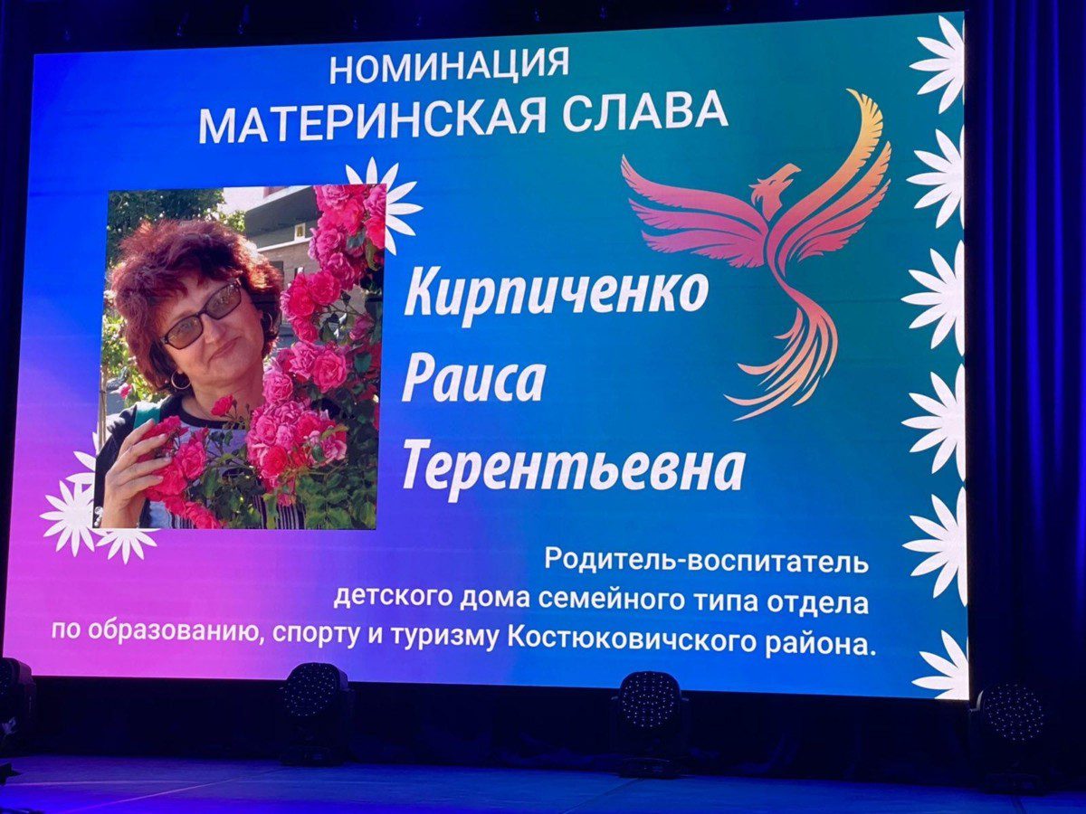 Дипломом в номинации «Материнская слава» была награждена Раиса Терентьевна Кирпиченко — родитель-воспитать детского дома семейного типа отдела образования спорта и туризма Костюковичского района.