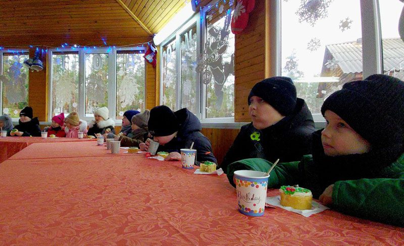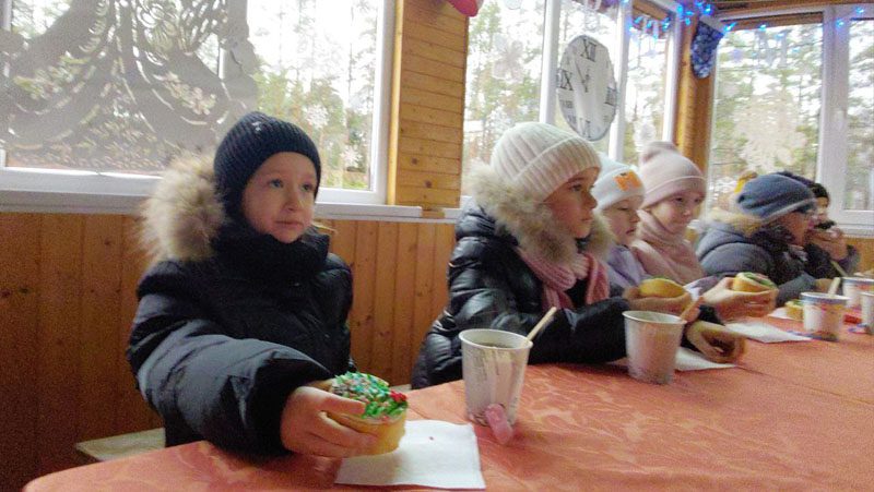 Все вместе зажигали елку и водили хороводы возле нее. Атмосфера была теплой: смех, песни, совместные игры — то, ради чего и приехали дети. А еще вкусные пирожные с горячим чаем и, конечно же, подарки от Деда Мороза и Снегурочки!