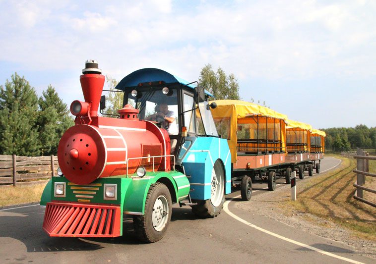 Экскурсию по Припятскому национальному парку мы совершили на паровозике. А состоит он из ведущего локомотива – красочно оформленного трактора «Беларус» и прицепленного к нему состава в количестве 3 вагончиков общей вместимостью 70 человек.