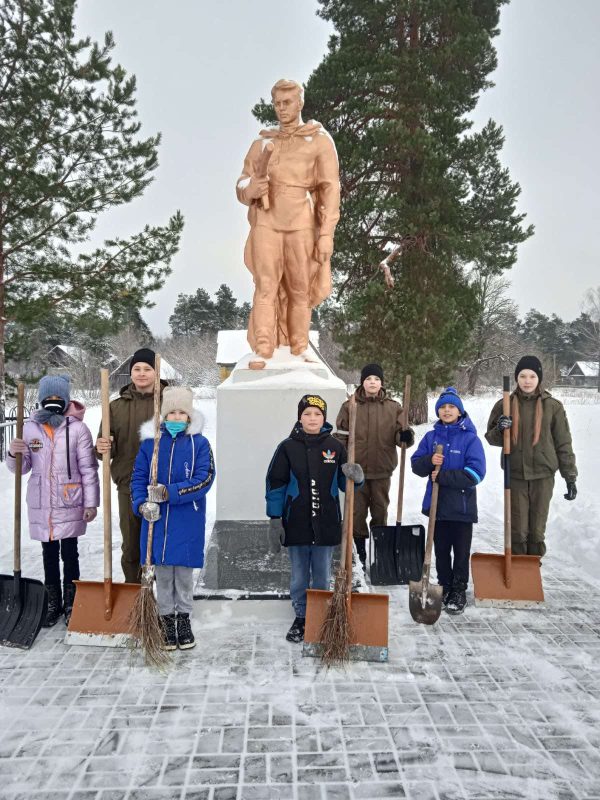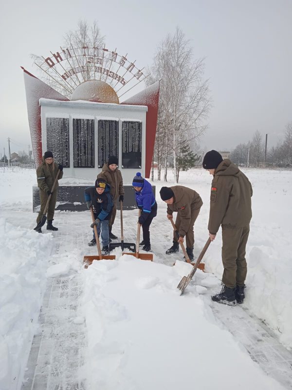 В это время воспитанники военно-патриотического клуба «Зубр», учащиеся Белынковичской средней школы очистили от снега дорожки к воинскому захоронению и памятному знаку в деревне Белынковичи.