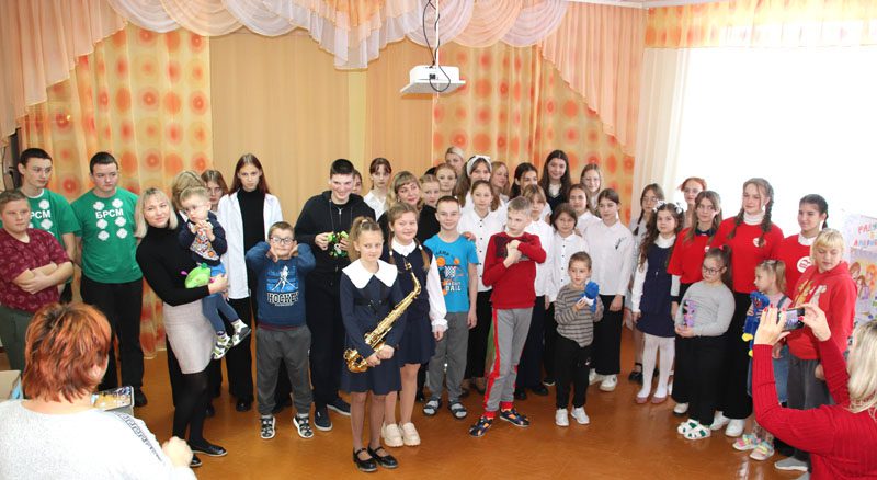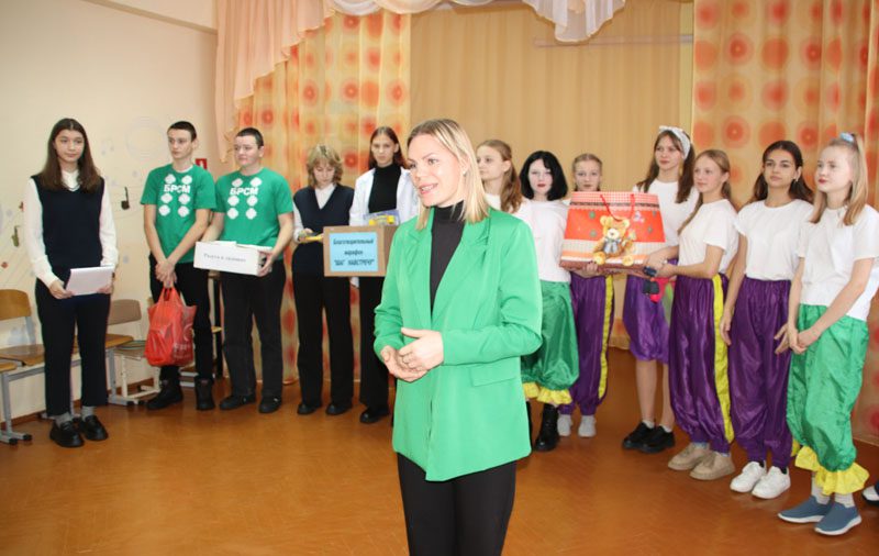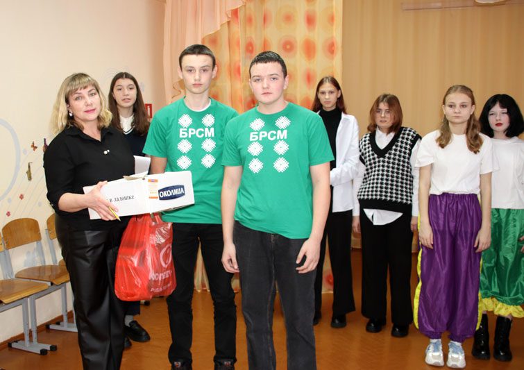 Участники концертно-развлекательной программы, а также представители детского сада №2 г.Костюковиичи преподнесли собранные во время акции «Радуга в ладошках» подарки с пожеланиями добра, здоровья и благополучия детям, обучающимся в ЦКРОиР.
