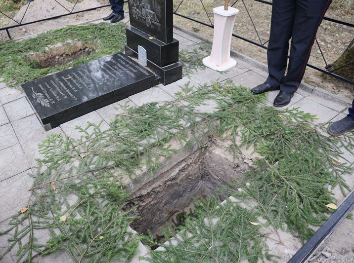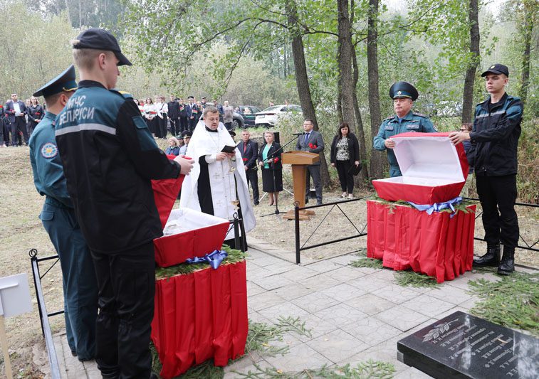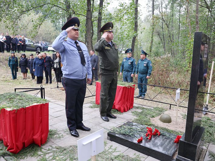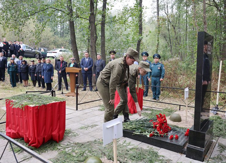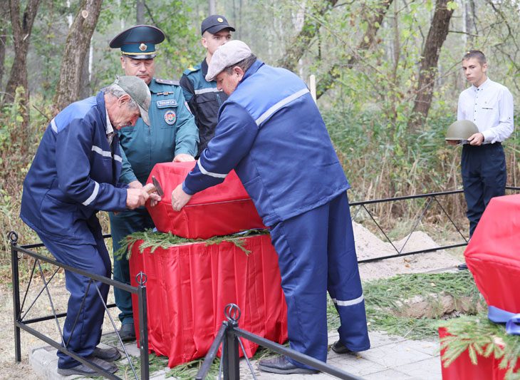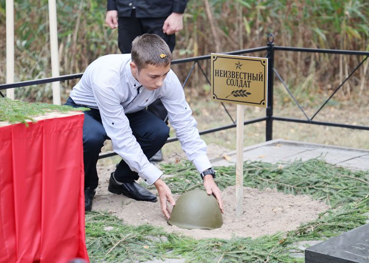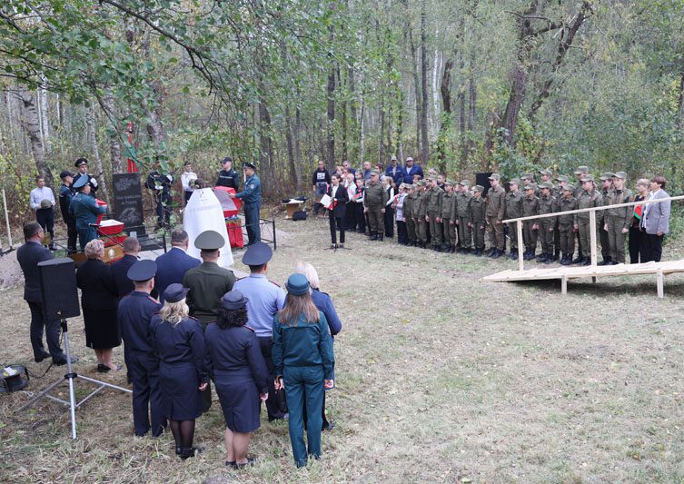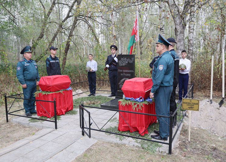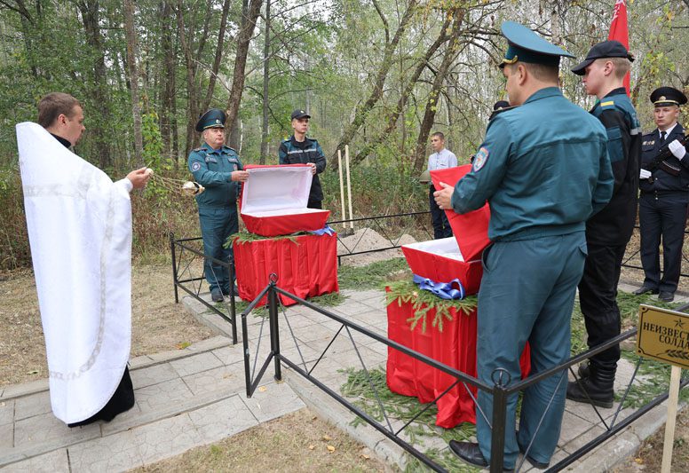 Память погибших почтили минутой молчания все присутствующие. Панихиду об упокоении душ погибших воинов совершил священнослужитель отец Кирилл. Под звуки гимна останки воинов нашли свой последний приют в земле, за которую они сражались и героически погибли. К изголовью захоронений установили таблички с надписью «Неизвестный солдат» и возложили цветы.
