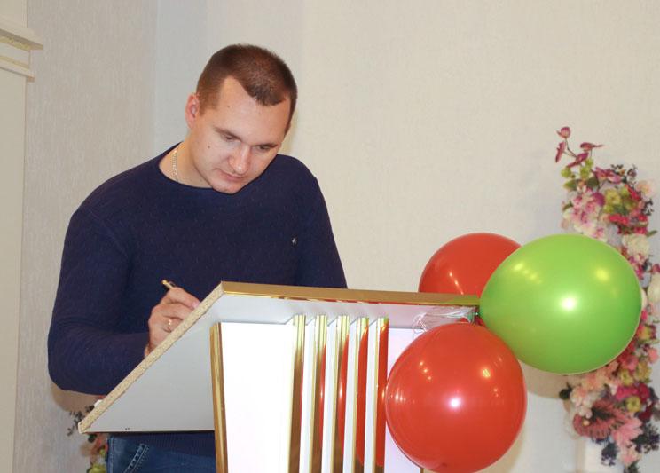 Подарки и сувениры вручили Руслану Чудопалу. У него с супругой Надеждой несколько дней назад родился сын. Пока мама с малышом находится в больнице, папа пришел в ЗАГС, чтобы зарегистрировать новорожденного. По счастливой случайности в День отца регистрация рождения ребенка оказалась сотой в этом году. Молодому папе торжественно вручили свидетельство о рождении сына, названного Тимофеем.