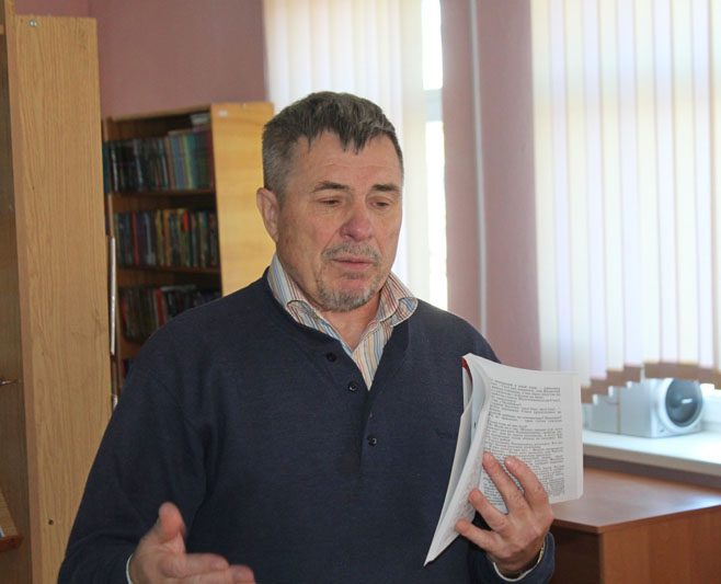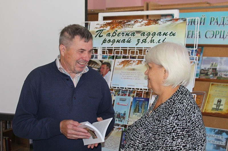 25 верасня творчую сустрэчу з моладдзю і іншымі прыхільнікамі яго таленту правёў вядомы беларускі пісьменнік, наш зямляк Віктар Уладзіміравіч Патапенка. Сустрэча традыцыйна прайшла у чытальнай зале раённай бібліятэкі – месце моцы для ўсіх, хто захапляецца літаратурай, хто толькі спрабуе знайсці свой шлях і для тых, хто ўжо стаў сапраўдным майстрам, як Віктар Патапенка. Зусім нядаўна Віктар Уладзіміравіч адзначыў 70-гадовы юбілей, і дырэктар бібліятэчнай сеткі Касцюковіцкага раёна Святлана Федасенка ад імя ўсіх касцюкаўчан павінашавала яго са святам і ўручыла юбіляру кветкі і падарунак.