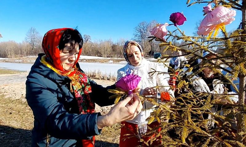 Па добрай традыцыі птушачак з цеста спачатку падкідвалі на хустачцы высока ў неба, запрашаючы вярнуцца з далёкіх падарожжаў, а затым з пяшчотай і клопатам развешвалі іх на бярозцы, ствараючы на галінках жывапісную карціну.