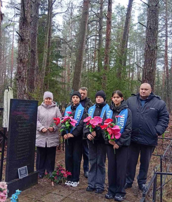 В памятный день миротворцы ГУО «Белынковичская средняя школа Костюковичского района» побывали на захоронении 8 мирных жителей, расположенном на гражданском кладбище в д.Большая Крапивная, которые были зверски убиты в годы Великой Отечественной войны только по той причине, что машина с немецким офицером была расстреляна партизанами неподалеку от этой деревни (в машине немцы насчитали 8 пулевых отверстий).