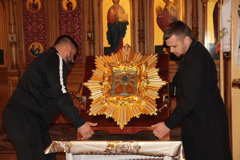 Крестный ход с православными святынями – Годеновским крестом, образ Николая Чудотворца с частичкой его мощей, которые были вмонтированы в крест, Жировичской иконой Божией Матери «Державный Покров» и «Магаданская», а также образ с частичкой мощей Святой Преподобной Зосимы Эннатской были принесены в Свято-Крестовоздвиженский храм г. Костюковичи.