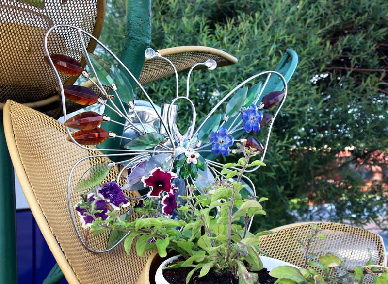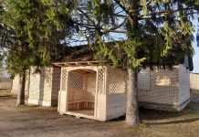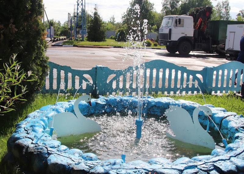 На ухоженной территории участка, помимо беседки, где можно отдохнуть в тени деревьев, привлекает внимание миниатюрный фонтан с парой лебедей, установлены металлические подставки для цветов, куда уже высадили рассаду петуний.