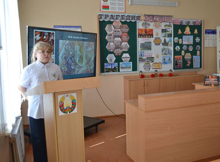 Классный руководитель 8 класса Киселева О.М. подготовила и предложила учащимся презентацию «Хатынь», в ходе которой ребята совершили заочную экскурсию по мемориалу, по музею, который погружает посетителей в драматическую историю Беларуси, и где шаг за шагом залы рассказывают о страшных моментах человеческой трагедии во время войны.