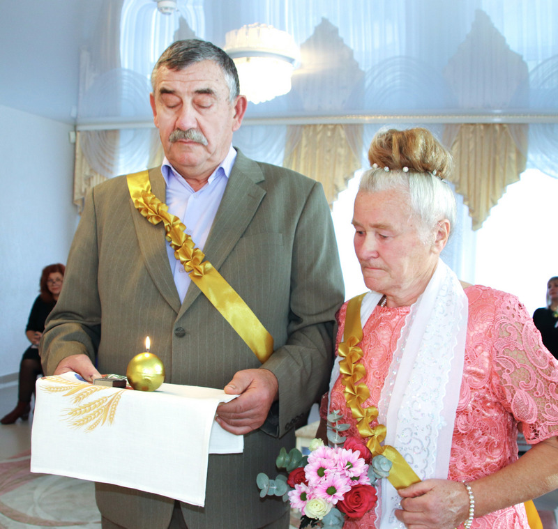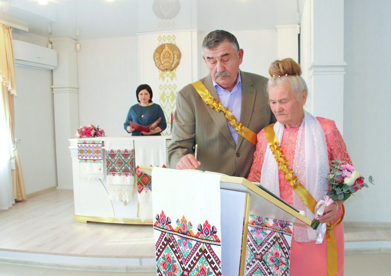 Золотые юбиляры в окружении многочисленных гостей заново пережили такое важное для их семей торжество. Они снова стояли на рушнике, символизирующем жизненный путь, ставили свои подписи в торжественной книге записей актов гражданского состояния Костюковичского райисполкома и также нежно, как многие годы назад, скрепляли свой брак поцелуем. Все, как и должно быть на свадебной церемонии: цветы, гости и, конечно, хорошее настроение.