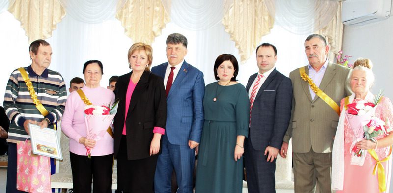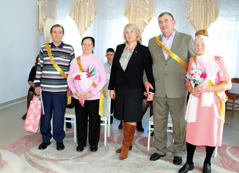 Так, полувековой юбилей свадебной жизни обеих пар был зарегистрирован. Александра Николаевна и Николай Михайлович вручили цветы, подарки и юбилейные свидетельства супругам Гапеевым и Козловым. Проникновенные слова были сказаны в адрес золотых юбиляров Александрой Михеенко: