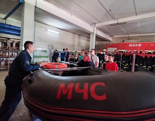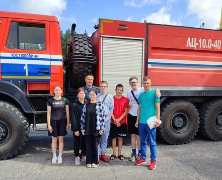 Первый день работы лагеря для ребят выдался насыщенным. Большие трудовые достижения начинаются с малых вершин познания профессий. Поэтому первыми шагами в профессию становятся профориентационные экскурсии на предприятия и организации района. Воспитанники лагеря посетили Костюковичский РОЧС. Инспектор Павел Добрыднев познакомил с тяжелыми трудовыми буднями спасателей-пожарных, провел экскурсию по пожарной части. Ребята изучили возможности пожарной техники, познакомились со специальной лодкой для спасения людей на водах, увидели тренажерный зал. Павел Александрович заодно наполнил ребятам о правилах безопасного поведения во время летних каникул.