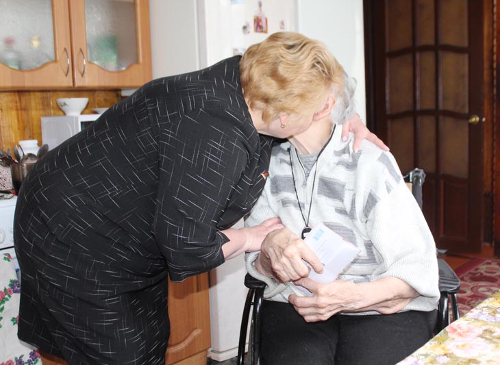 В этот же день председатель районного Совета депутатов Лариса Герасимова, начальник управления по труду, занятости и социальной защите райисполкома Оксана Сидоренко и волонтеры БРСМ отправились в деревню Пролетарское, где в отделении круглосуточного пребывания граждан пожилого возраста и инвалидов проживает Мария Воробьева. Ее отец служил на фронте и погиб в годы Великой Отечественной войны.