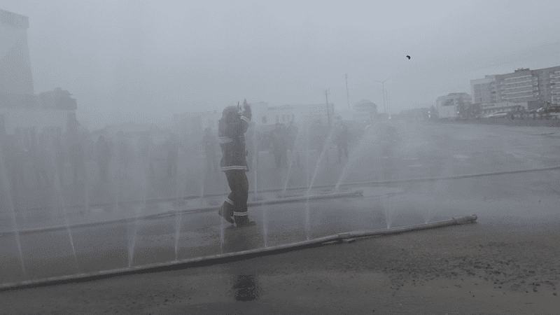 Затем, следуя традиции, новый «молодой пенсионер» под аплодисменты коллег и вой сирен прошел сквозь символическую водяную завесу.