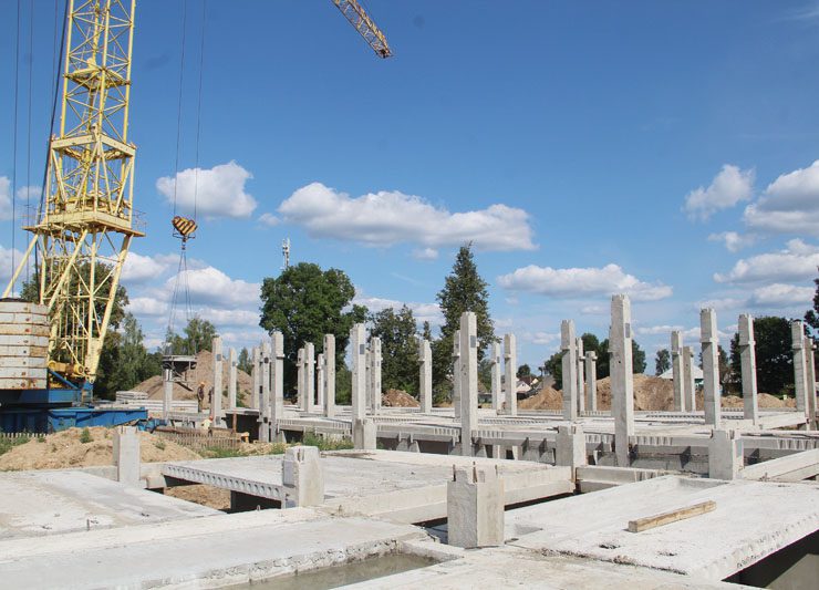 Стройка, действительно, впечатляет. Даже невооруженным глазом видны колоссальные объемы. По словам Сергея Вячеславовича, поставка железобетонных изделий – колонн, ригелей, диафрагм жесткости, плит перекрытия, лестничных маршей и площадок – осуществляется практически со всей Беларуси. Изделия доставляются железнодорожным и автотранспортом в зависимости от комплектации. Каждый день – по 50 единиц железобетонных конструкций. А вот щебень, песок и бетон привозят из Костюковичей.