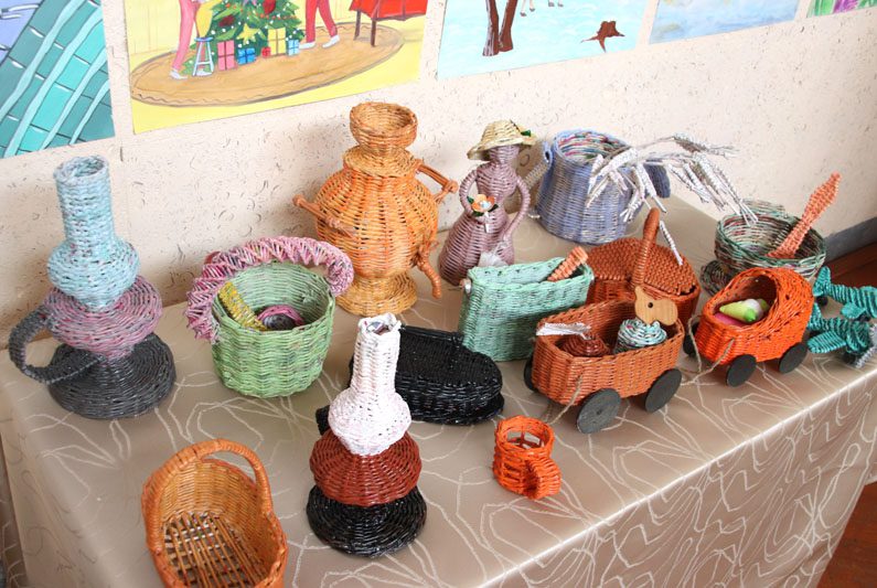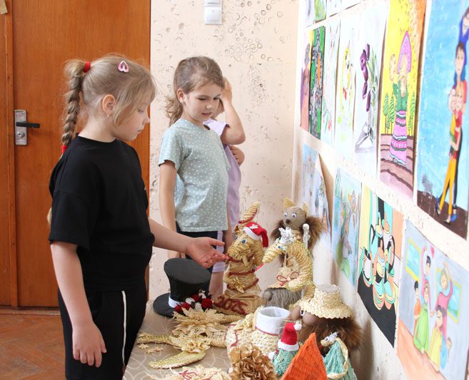 Среди творческих работ есть, конечно же, и экзаменационные. Здесь можно увидеть не только живопись, но и поделки из разного материала, а также соломоплетение. Среди работ из соломки представлено много новогодних поделок, например, разнообразные елочные игрушки, подковки, новогодняя елка с символом 2025 года змеей. Так что в жаркий июньский денек можно окунуться в атрибутику Нового года.