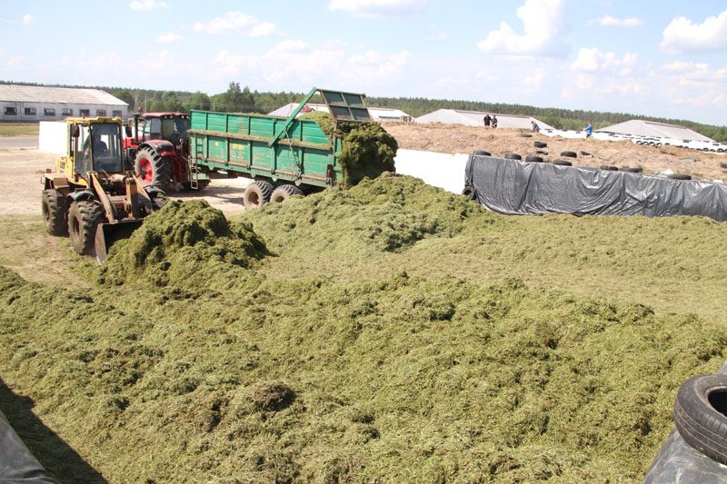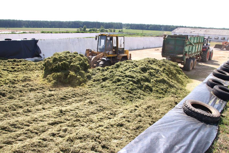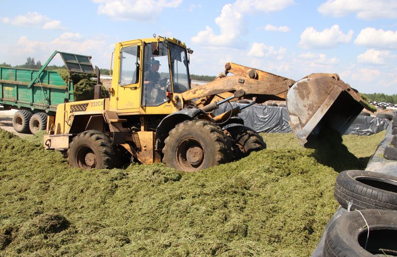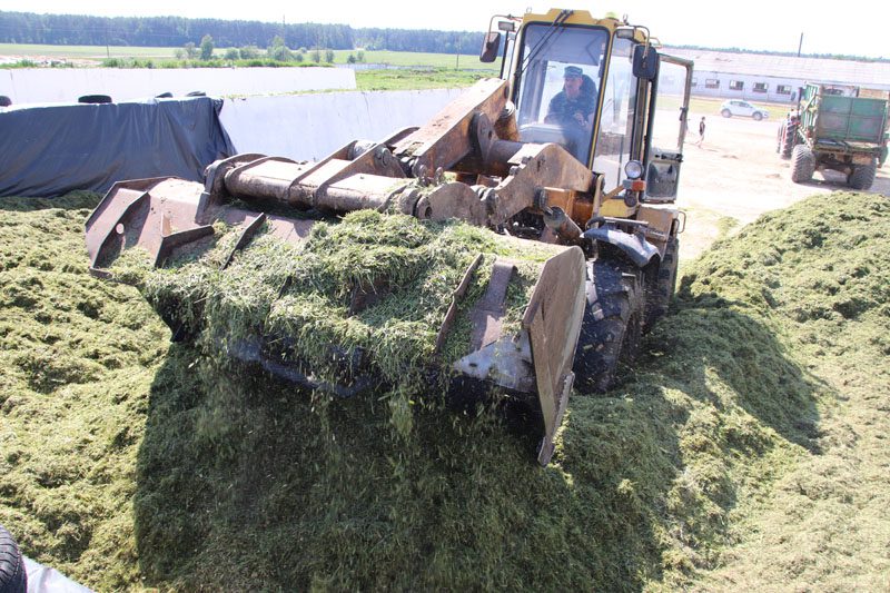 – Кормозаготовка из трав первого укоса проводится сейчас на полях в деревне Каничи и поселке Вишенский, – рассказывает Николай Иванович. – Ведется заготовка сенажа и параллельно заготавливаем сено. Уже скошено 50 процентов трав на пятистах гектарах сельхозугодий, заготовлено около 50 тонн сена, 2340 тонн сенажной массы заложено в траншею. Начали заполнять вторую сенажную траншею, которая находится на МТФ «Каничи». К уборке в хозяйстве подошли с особенной тщательностью: здесь и технология играет роль, и время. По словам главного агронома, технология приготовления сенажа достаточно сложная и состоит из нескольких операций: скашивание и плющение, ворошение и провяливание травы в поле до влажности 55–60 процентов, подбор с измельчением, транспортировка, закладка в сенажную траншею, тщательная трамбовка и укрытие. На каждом участке работ – опытные механизаторы на современной технике. Владимир Раздёрин и Сергей Лабыко косили травы на УЭС-250 с косилкой «КПР-9» и на тракторе МТЗ-1221 с косилкой «КПР-310». Иван Васекин сгребал травы в валки граблями-валкообразователями. Подбирали травы с одновременным измельчением на КВК-800 Александр Бесценный и Петр Потапенко, механизатор РАПТЭ. Отвозили сенажную массу в подготовленную траншею Эдуард Бондарев, Александр Кудло и Владимир Дюндин.